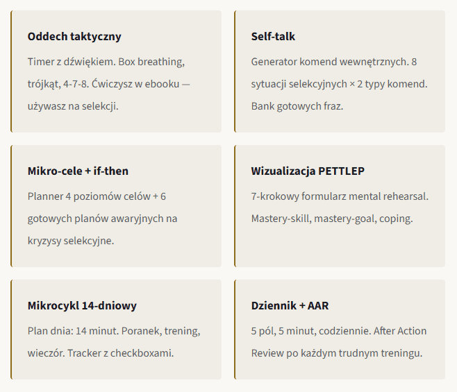 Plus: radar charty kompetencji (HPO, 9 cech UK SF, PCR), samoocena resilience (10 czynników Southwick & Charney), checker przetrenowania, test czasu reakcji, lejek narzędziowy na selekcję, rutyna przedzadaniowa PPR, protokół powrotu po nieudanej selekcji.