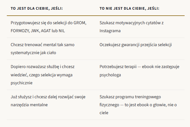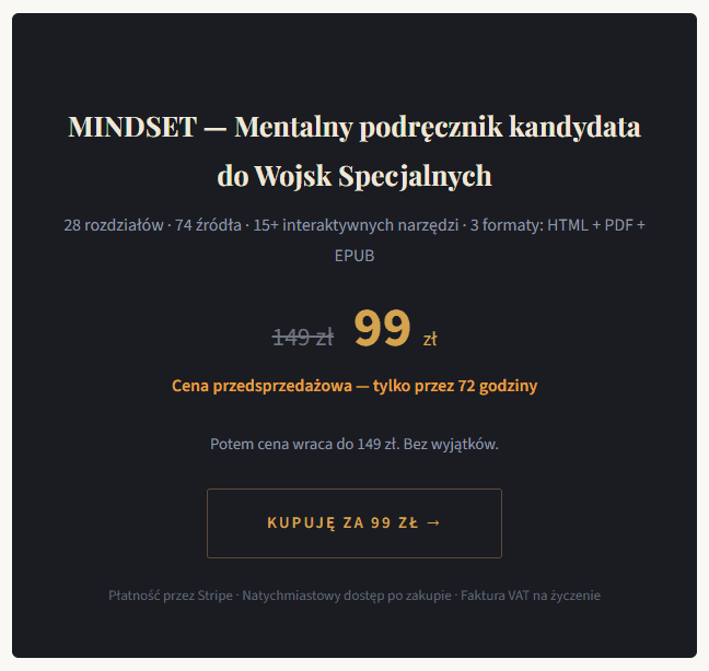 Dziś startuje MINDSET — pierwszy polski ebook o treningu mentalnym napisany specjalnie dla kandydatów do GROM, FORMOZY, JWK, AGAT i NIL. 28 rozdziałów. 74 źródła naukowe. Interaktywne narzędzia. Zero motywacyjnej gadki.